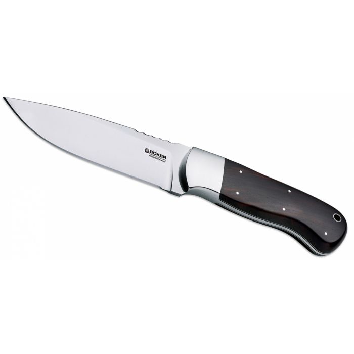 На обухе клинка ближе у рукоятке есть специальное место для упора под большой палец, которое пригодится при работе с особенно твердыми материалами. Еще одной яркой отличительной чертой ножа Boker Drika является его рукоятка, которая изготавливается из дорого африканского розового дерева. В комплекте с ножом можно найти ножны, изготовленные из качественной кожи.